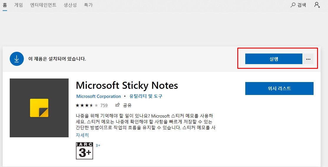 설치 방법에 따라서 설치와 실행을 누르고 나면 금세 pc에 스티커 메모 앱이 설치가 되었음을 알 수가 있다. 정상적으로 잘 설치가 되었는지를 확인하고자 한다면 시작 버튼을 누르거나, 검색을 통해서 확인이 가능하다.