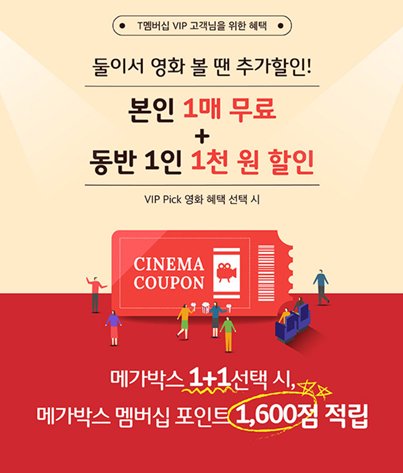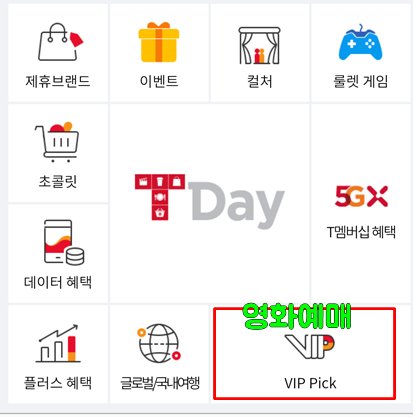 T월드에 접속하면 VIP 등급의 경우 위와 같은 VIP Pick를 확인할 수가 있다. 티멤버십 영화예매는 여기서 가능하니 한번 들어가 보자.