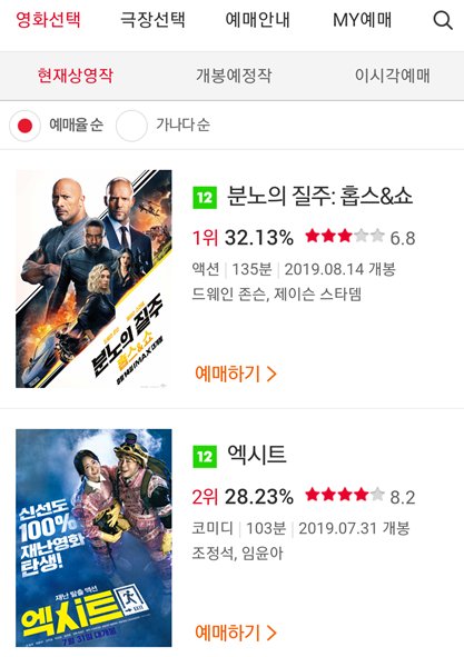 영화를 살펴보니 현재 상영작들이 예매율 순으로 안내가 되고 있다.