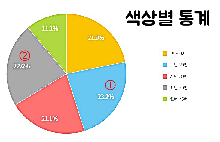 로또 색상별 통계를 살펴보면 지금까지 11번~20번대 구간이 23.2%로 가장 많은 1등 번호를 배출했다. 그다음으로 21번~30번 1번~10번 순으로 확인할 수 있다.