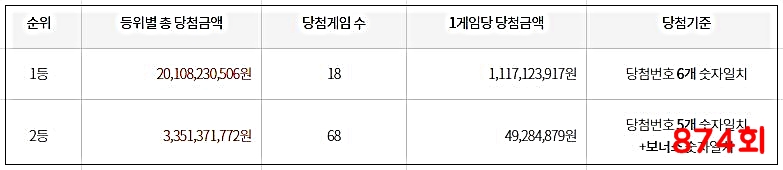 18명의 로또복권 1등 당첨자가 나오면서 874회 1등 당첨금은 11억원으로 지난주에 비하여 7억 원 정도가 줄었다.