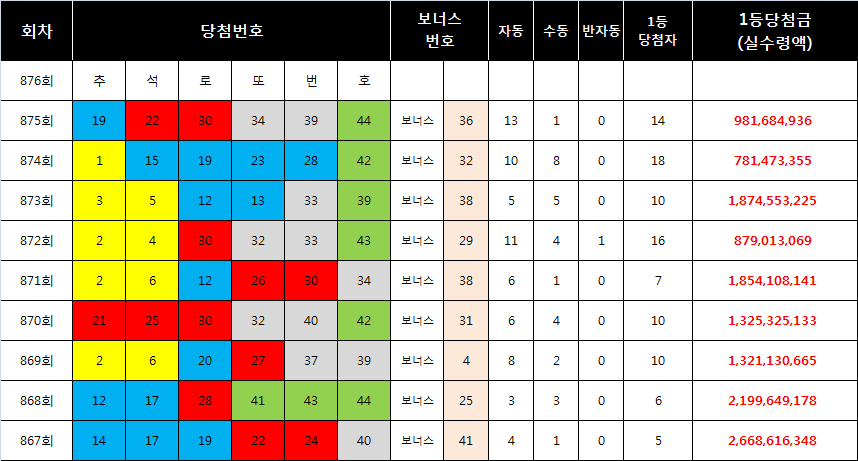 14명의 당첨자가 발생한 875회 로또번호 추첨에서 자동구매를 통하여 복권을 구매한 사람이 13명인 것을 보면 수동 구매보다도 자동 구매가 훨씬 유리하지 않을까 생각한다.