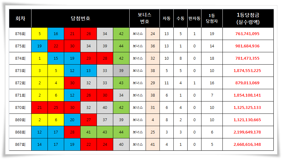 로또877회 예상번호 역시 이를 토대로 분석해보는 것이 좋지 않을까 생각한다.