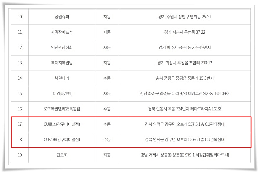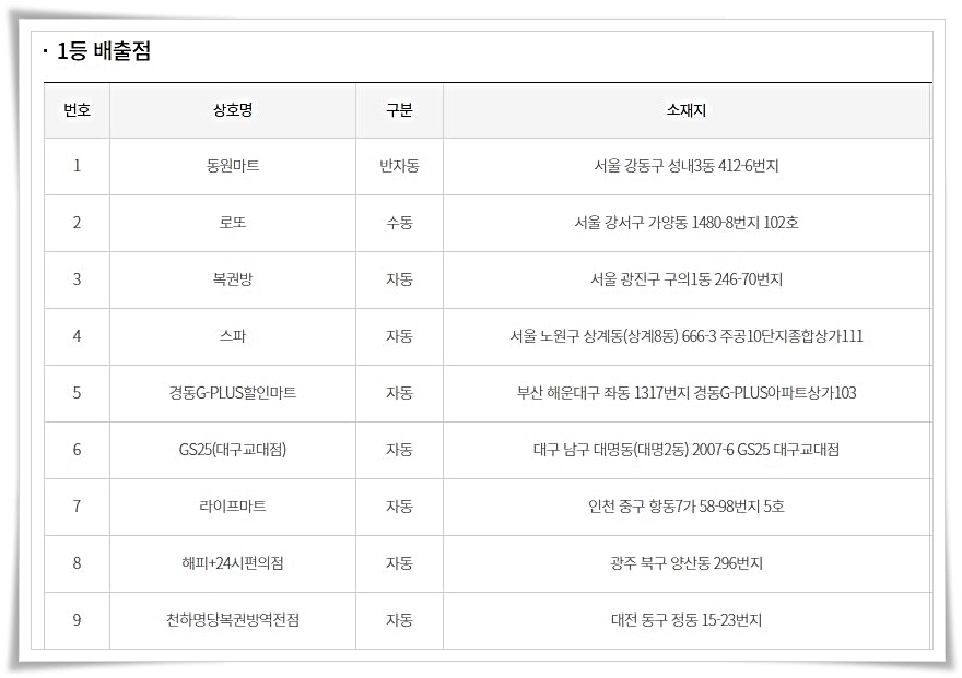 1등 당첨자의 경우 수동구매자가 경북 영덕군 강구터미널에 위치한 cu 편의점에서 나온 것을 비롯하여 2등 당첨자들도 한 곳에서 적게는 두 명 많게는 다섯 명이 배출되었다.