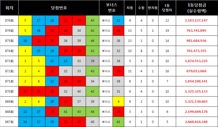 최근 3개월 간의 로또번호 통계 모음에서 보명 알 수 있듯이 1등 당첨금 실수령액을 살펴보면 한 가지 특이한 점을 알 수 있다.