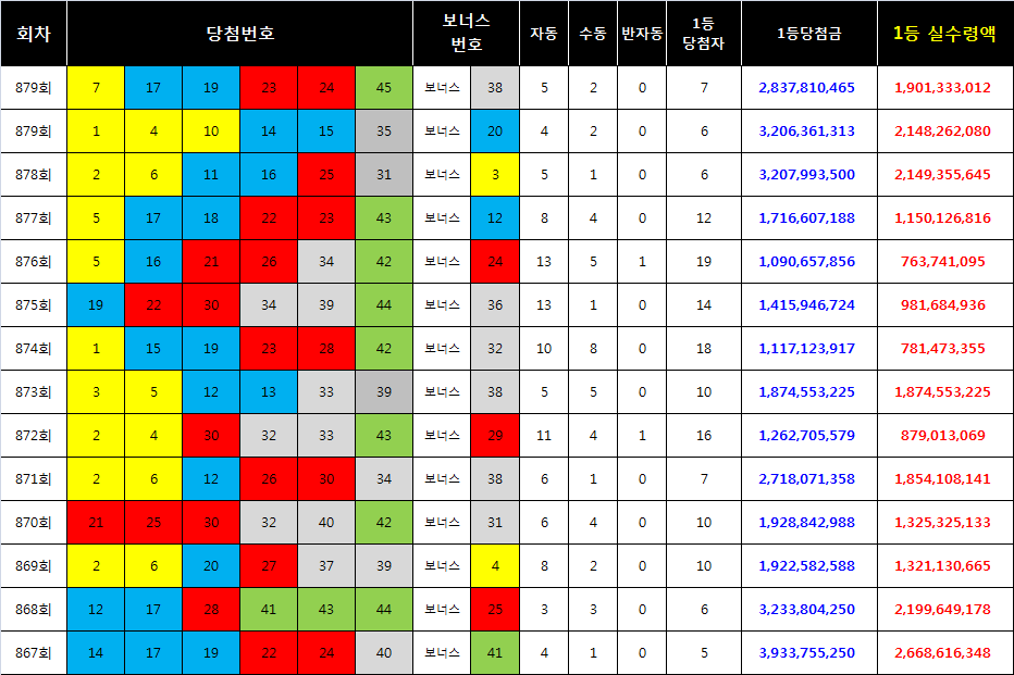 어디까지나 통계에 의한 자료이기 때문에 다음 주에는 어떻게 변할지 예상할 수 없지만 이러한 자료를 통해서 로또번호 조합 시 참고하는 것도 하나의 방법이 될 수 있다.