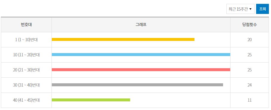 최근 15주간으로 설정을 해놓고 비교해 봤을때  10번대 구간과 20번대 구간이 가장 많은 1등 번호를 배출한 것을 확인할 수 있다.
