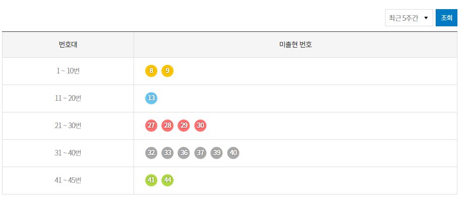 또한 최근 미출현 번호들도 확인할수 있는데 최근 5주간의 기록을 살펴보면 위와 같은 번호들이 5주 동안 단 한 번도 출현하지 않은 번호들이라고 할 수 있다.