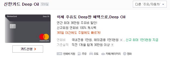 신한카드가 내세우고 있는 Deep Oil 카드 연간 최대 36만 원의 주유비를 할인받을 수 있다.