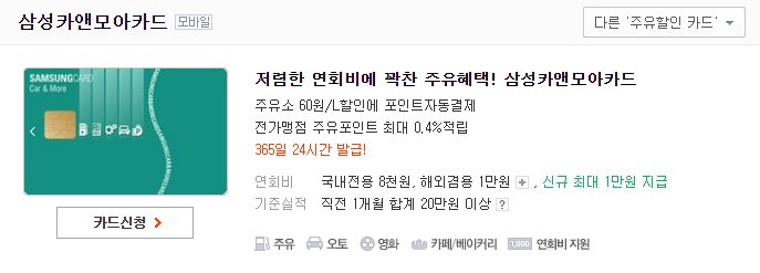 삼성 카앤모아카드는 모든 주유소에 대한 혜택을 제공한다. 리터당 60원 할인. 스타벅스 결제 시 1,000원 할인, CGV 동반 1인 50% 할인 혜택을 제공한다.