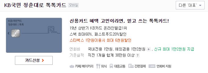 전월 실적 30만 원 이상 연 회비 국내 1만 원, 해외겸용 12,000원이다.