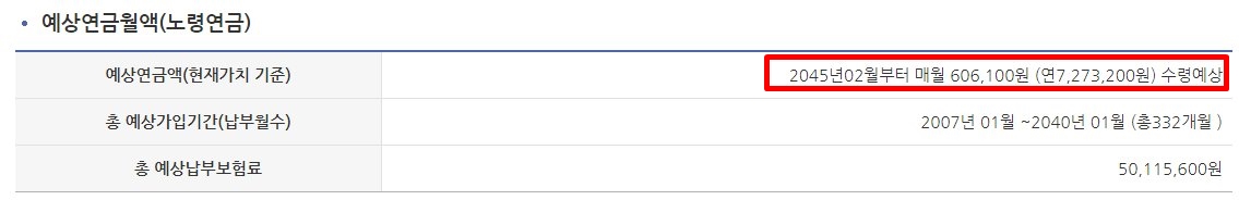 그리고 그 아래를 살펴보면 국민연금(노령연금) 예상수령액을 확인할 수 있는데 지금처럼 2045년까지 납부시 월 60만원 정도의 노령연금을 수령할수 있다고 아낸가 된것을 확인할수 있다.