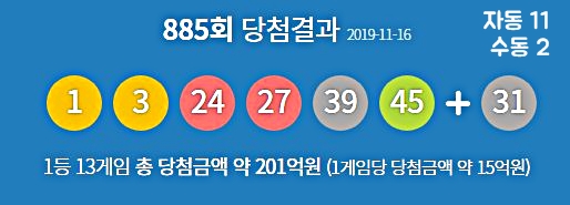 지난주 발표된 로또885회 당첨번호 추첨에서는 전국적으로 총 13명의 당첨자가 나왔다. 자동구매 11명 수동구매 2명으로 역시 자동 구매자들의 당첨확률이 높았다고 한다.
