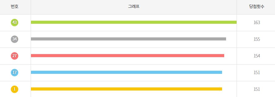 그동안의 로또당첨번호 통계를 토대로 이번 주도 예상번호를 분석해 보았다. 동행 복권 홈페이지에서 제공하는 로또당첨번호 통계를 살펴보면 43, 34, 27, 17, 1번 순으로 지금까지 1등 번호로 가장 많이 출현한 것을 알 수 있다.