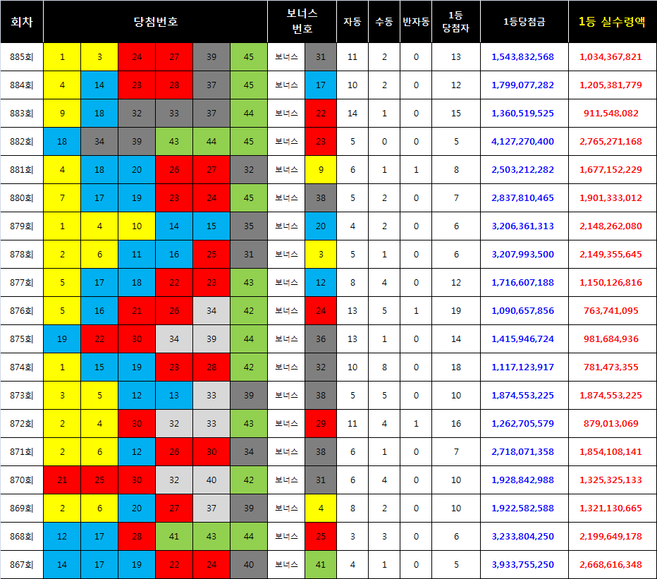 1인당 15억원 정도를 받게 되는 885회 차의 경우 실수령액은 1,067,368,151원이다. 3억 원 이상 초과 시 제하게 되는 33%의 세율을 적용하기 때문이다.