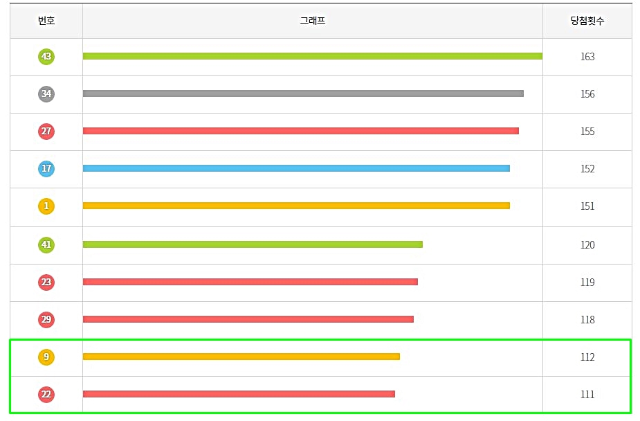 상위 5개의 번호들을 보면 150번 이상 1등 번호로 출현한 적이 있는데 반하여 하위 5자리의 숫자들은 120번도 출현을 하지 않았으니까요.