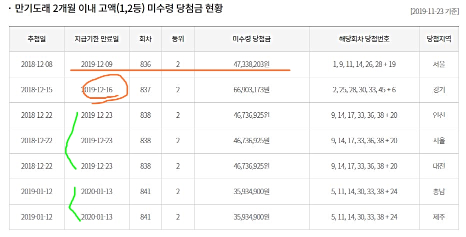 동행 복권 사이트에 제공되어 있는 자료들을 참고하다가 살펴보니 2등에 당첨이 되었음에도 불구하고 아직 까지 당첨금을 찾아가지 않은 분들이 있다고 합니다. 1년 안에 찾아가지 않으면 복권기금으로 귀속된다고 하는데 당첨되고도 찾아가지 않은 분들이 의외로 많은 것 같습니다.