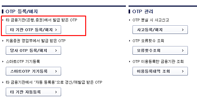 그래서 OTP 자동 타기관 등록을 하기 위해서 키움증권 홈페이지에 들어갔다.