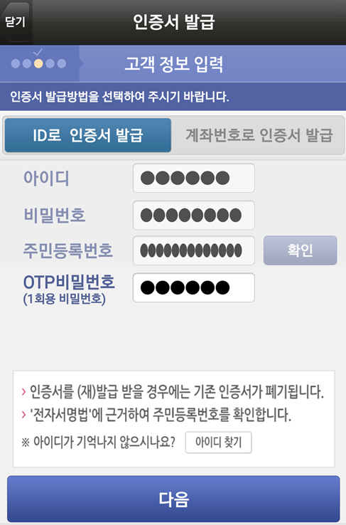 먼저 인증서 재발급을 위해서 버튼을 누르고 해당 페이지로 접속을 했다.