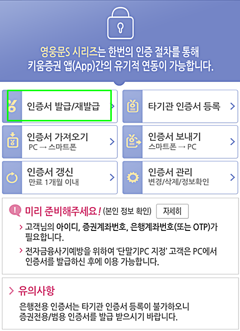 모바일 어플을 주로 활용하는 나는 키움증권 앱으로 들어가서 인증서 재발급 버튼을 눌렀다.