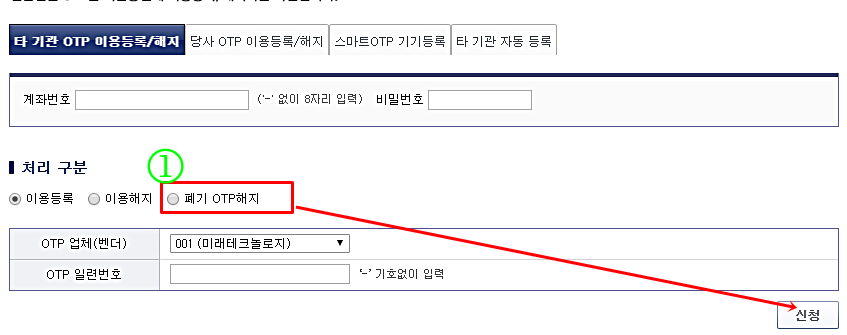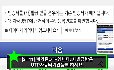 분명 OTP카드 번호를 잘 넣었음에도 불구하고 폐기된 OTP카드라고 OTP 자동 타기관 등록하세요라고 나왔다.