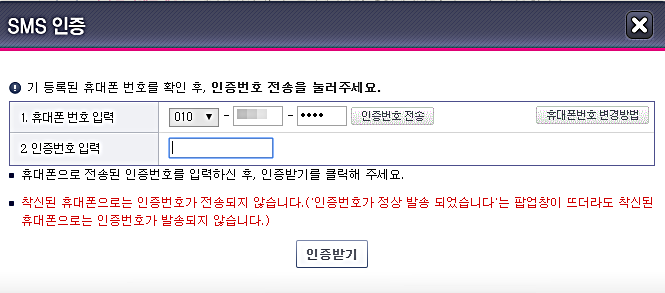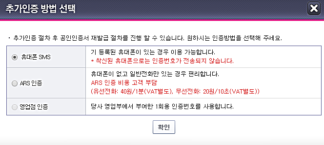 인증은 휴대폰 SMS 인증, ARS 인증, 영업점 인증 중 한 가지의 방법으로 선택하면 된다.