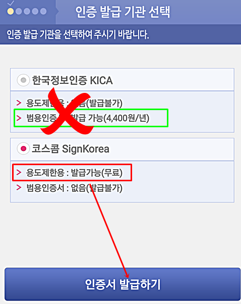 인증서가 발급된 줄 알았는데 마지막까지도 범용 인증서와 무료 인증서를 선택하도록 나와있는 것을 보면 정말 유료 인증서를 너무나도 권장하는 느낌이 든다.