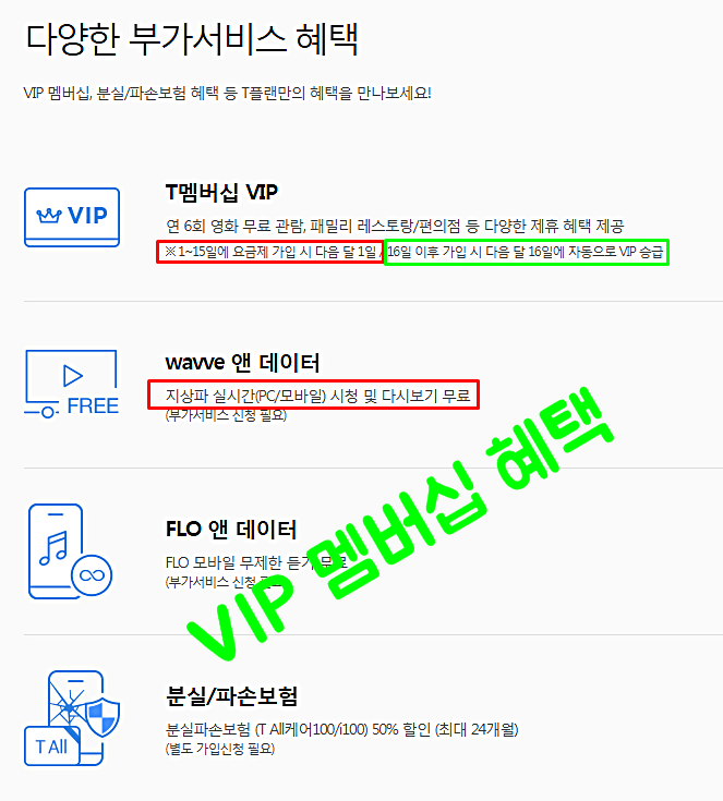 매월 1~15일 기간동안 해당요금제로 변경시 다음달 1일에 VIP 등급으로 변동되고, 16~말일에 변경시 다음달 16일에 자동으로 변동이 된다.