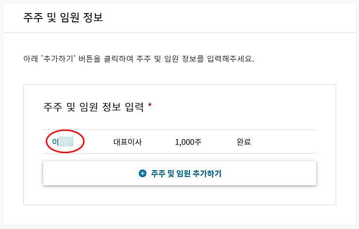 다음 화면으로 넘어가니 대표이사로써 주식을 갖고있는 사람으로 나의 이름이 표시되고 있는것을 알수있다.