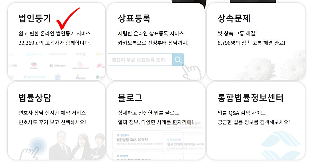 헬프미 홈페이지에 들어가면 법인등기, 상표등록, 상속문제, 법률상담등 다양한 서비스를 제공하고 있다.