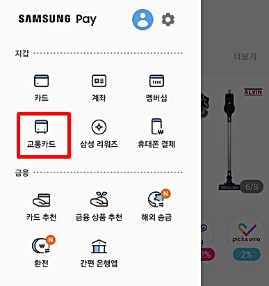 핸드폰에 메인화면 하단에 있는 SAMSUNG PAY를 불러온 후 왼쪽 상단에 있는 三을 누르면 교통카드 기능이 있는 것을 확인할 수 있다.