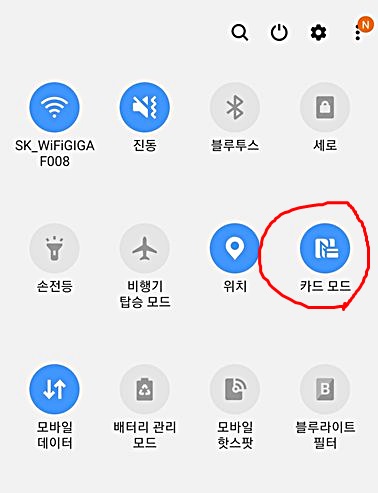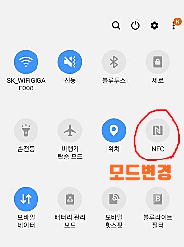 삼성페이 교통카드를 사용하기 위해서는 이 NFC를 카드 모드로 변경해줘야만 가능하다.