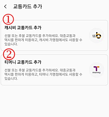 교통카드 기능을 사용하는 방법은 여러 가지가 있다. 기존에 사용하고 있는 후불제 교통카드(신용카드)를 사용해도 되고 티머니 교통카드를 추가해서 사용해도 된다.