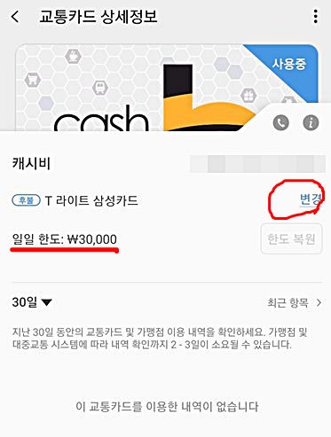 일일한도가 30,000원으로 정해져 있고, 여러 개의 카드를 등록하더라도 주 교통카드를 지정할 수 있는 것이 장점이다.
