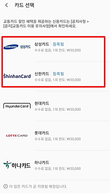 한 가지 아쉬운 점이 있다면 현재 교통카드 기능을 지원하는 카드사가 현대, 롯데, 하나카드까지 총 5군데 밖에 안된다는 점이다.