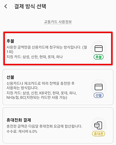후불제 교통카드, 선불, 휴대전화 결제 등 다양한 방법이 존재하는데 기존의 카드를 사용하는 사람이라면 후불을 선택하면 된다.