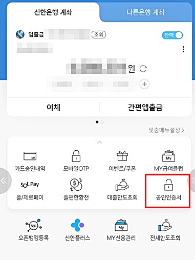휴대폰을 통하여 은행 어플에 접속하면 공인인증센터가 있다.