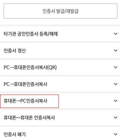 인증서 관련 업무는 모두 이곳에서 진행할 수가 있는데 안내 목록에 나와있는 것처럼 휴대폰에서 PC로 인증서 복사를 선택해 보자.