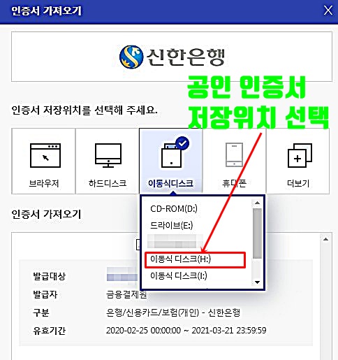 확인을 누르고 나면 공인인증서 저장 위치를 선택하라는 안내가 나온다.