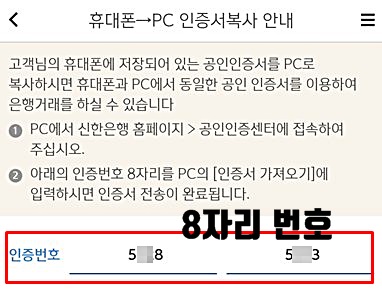 휴대폰 공인인증서 복사를 선택하면 8자리의 인증번호가 나오는 것을 알 수 있다.