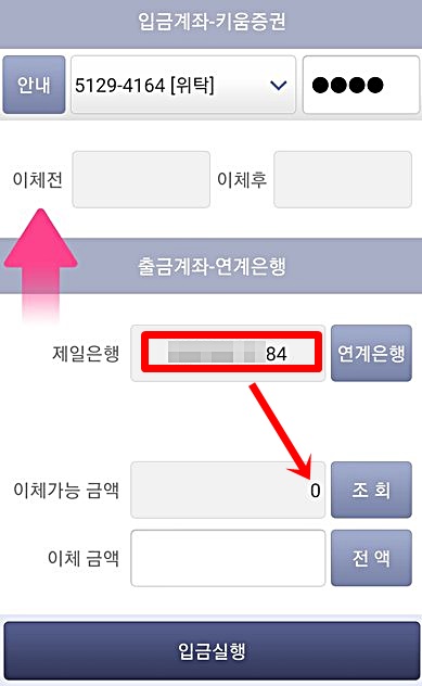 이체 가능금액 조회 버튼을 누르면 자신의 통장에 어느 정도의 돈이 들어있는지 확인이 가능하다. 여기서 자신이 증권계좌로 이체하고 싶은 금액만큼을 설정한 후 입금 실행을 하면 해당 금액은 자신의 증권계좌로 입금이 된다.