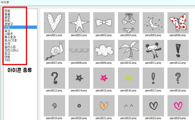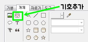 기호 추가는 아래 도구 상자 중에서 하트 표시 모양을 누르면 기본 제공되는 아이콘을 선택할 수 있습니다.