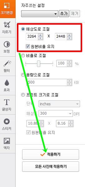 여기서 한 가지 주의할 점은 한꺼번에 여러 사진을 일괄 편집하고자 할 경우에는 모든 사진에 적용하기 버튼을 누르면 일괄처리가 된다.