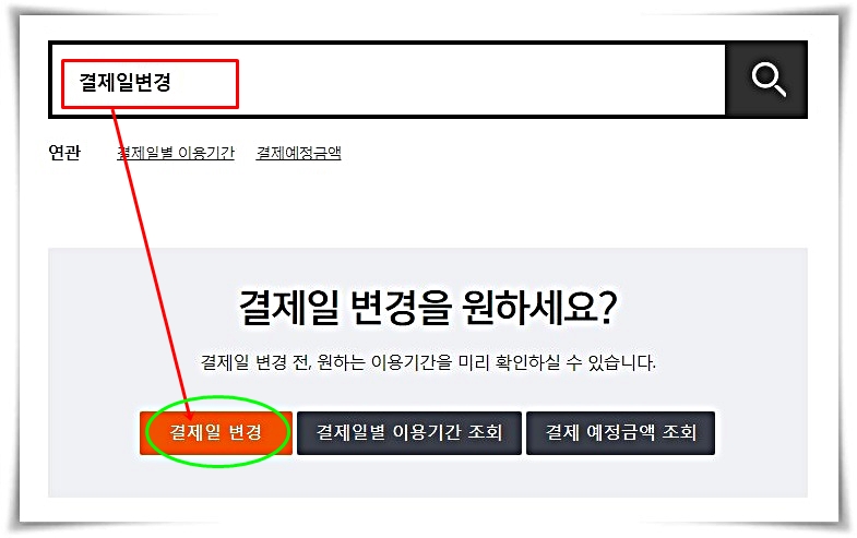 홈페이지에 접속 후 검색창에 결제일 변경 또는 결제일별 이용기간을 검색하면 관련 정보가 나오는 것을 확인할 수 있습니다.