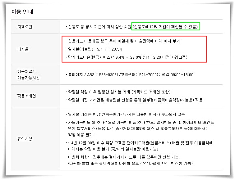 직접 사용하면서 느낀 점이지만 가급적이면 사용하지 않는 것이 좋다는 생각이 들었던 것 같습니다. 지불능력이 없음에도 불구하고 지속적으로 사용할 경우 결국은 사용한도에 도달하게 되면 더 이상 리볼빙 또한 적용이 안되고 연체가 되기 때문입니다.