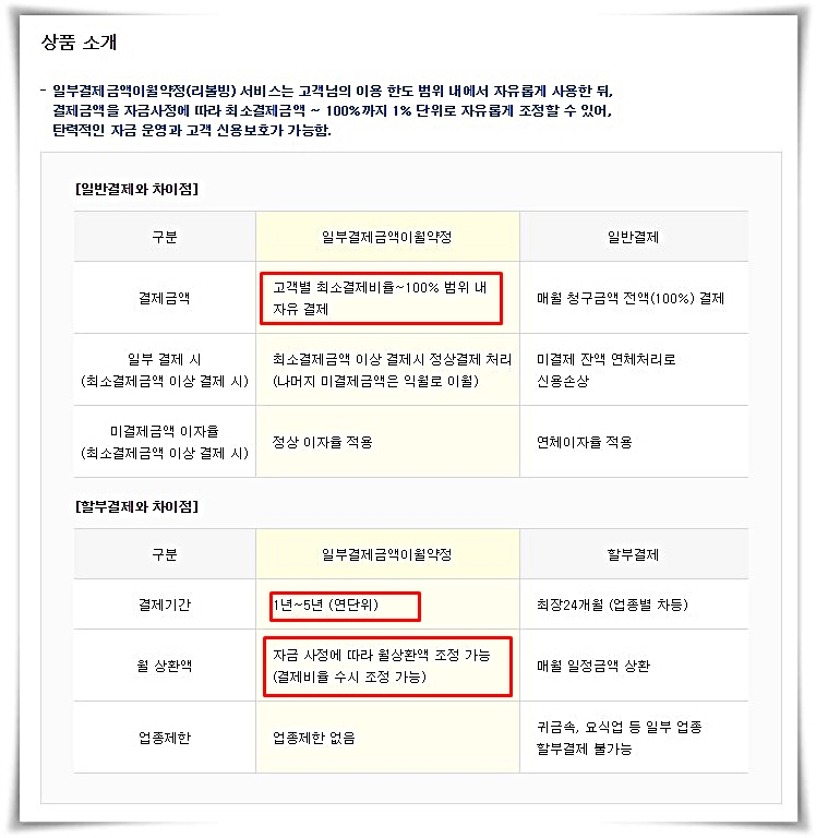 일반 결제의 경우 사용금액 100%를 결제해야 하는 반면 리볼빙은 자신이 최소결제비율을 직접 설정할 수가 있는 자유결제가 가능합니다.