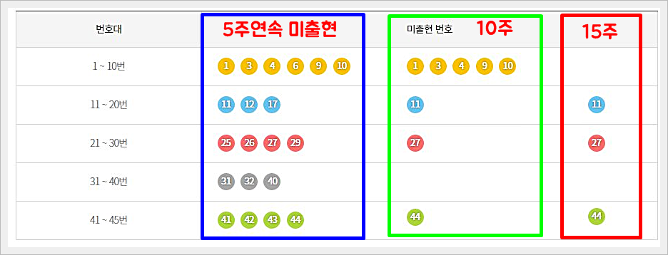 자주 나오는 번호들은 그만큼 출현율이 높지만 그렇지  않은 경우는 차이도 많은 것 같습니다.