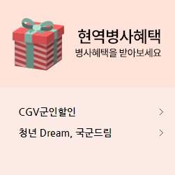 군인들의 경우 영화관에서도 할인을 받을수 있어서 휴가 나온 장병들도 많이 이용하는 편인데요. 휴대폰까지 저렴하게 구매할 수 있다고 하니 일석 이조가 아닐까 싶습니다.