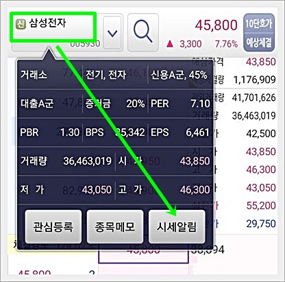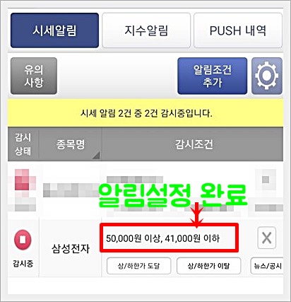 여기서 종목 이름을 눌러보면 아래와 같이 시세 알림이 있는것을 확인할수 있습니다.