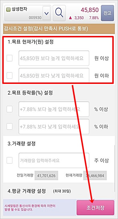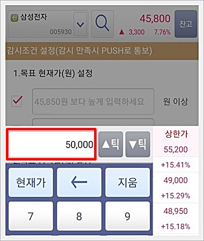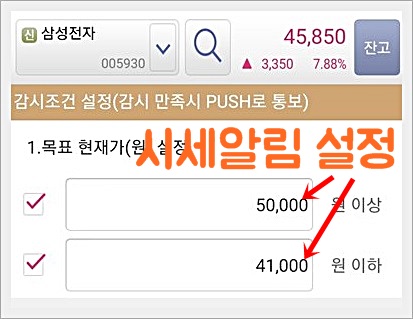 반대로 계속 떨어지는 주식으로 인하여 추가 매수를 하고 싶거나, 손절하고 싶은 경우 자신이 정한 최저금액을 설정해 놓으면 해당 시세 도착 시 알림을 받을 수 있습니다.